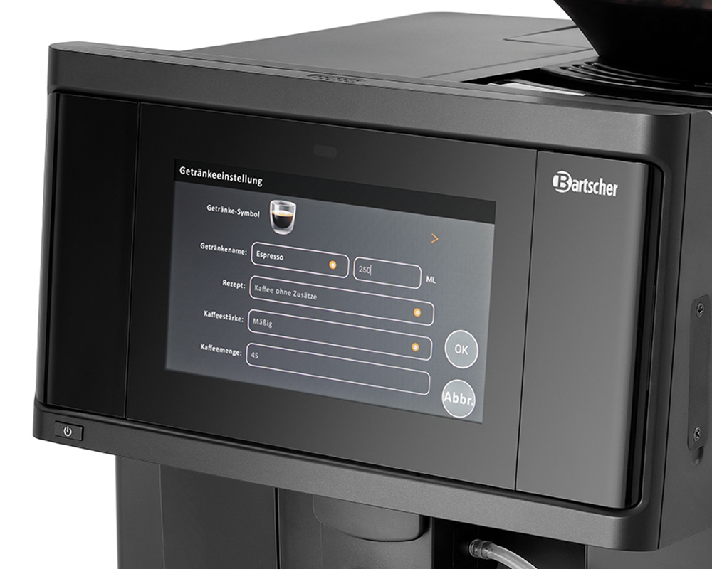 Was gibt es intuitiveres als eine Kombination aus Bildsprache und Touch-Display. Mit eindeutiger klarer Symbolik führt der Vollautomat durch die Bedienung und informiert über die Programme, den Getränke- sowie den Geräte-Status. Das werbewirksame Display lädt mit Bild und Ton in bester Qualität zu einer genussvollen Tasse Kaffee ein.