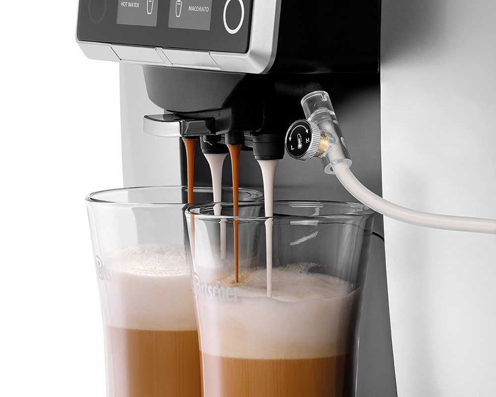Die integrierte Milchdüse sorgt für die jeweils optimale Milchkonsistenz bei Spezialitäten wie Latte Macchiato oder Cappuccino. Über den Milchschlauch mit Durchflussregler kann anhand der Durchflussmenge die Milchtemperatur beeinflusst werden.