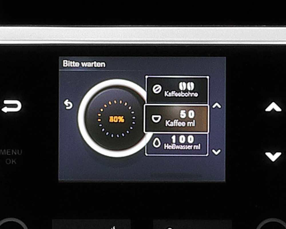 Das Gerät bietet bis zu 6 individuell einstellbare Programme für die verschiedensten Kaffeevariationen und eine zusätzliche Heißwasserfunktion. Der Tassenzähler und das Entkalkungssignal sorgen für eine gute Übersicht und erleichtern die Wartung.
